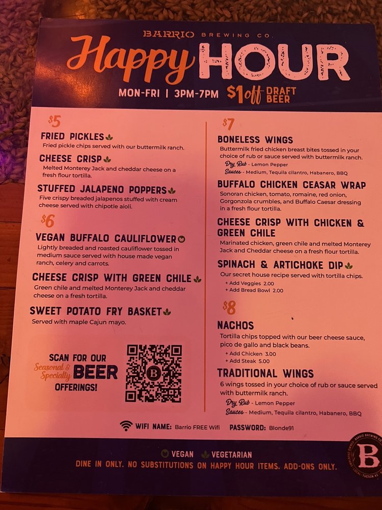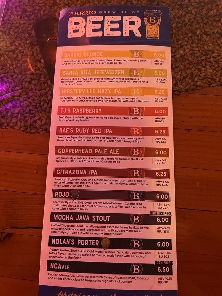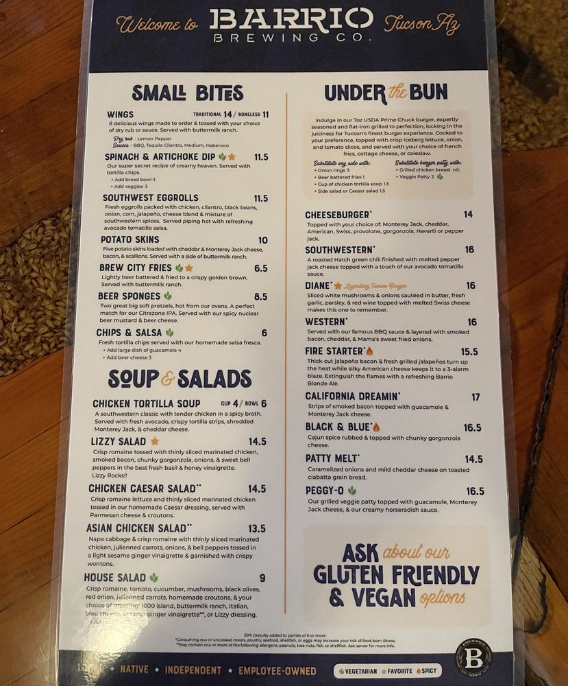 Barrio Brewing, a popular American eatery in Tucson, delivers a vibrant dining experience with diverse offerings. From Asian Chicken Salad to Brew City Fries, the menu is a delightful mix of flavors and textures. Customer favorites like the California Dreamin' burger and Buffalo Wings with tequila-cilantro sauce showcase the restaurant's commitment to bold, innovative dishes. The relaxed atmosphere at Barrio Brewing is perfect for casual gatherings or special occasions, with ample seating options and a modern, spacious setting. The extensive beer selection, including house-crafted IPAs and blondes, complements the menu perfectly, making it a go-to spot for craft beer enthusiasts. With friendly service, a lively ambiance, and delicious food and drinks, Barrio Brewing promises an unforgettable dining experience in Tucson.